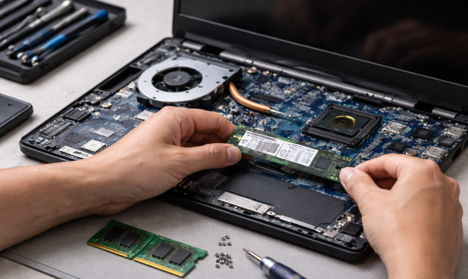 Tingkatkan performa laptop Anda dengan upgrade SSD, RAM, dan komponen lainnya.
