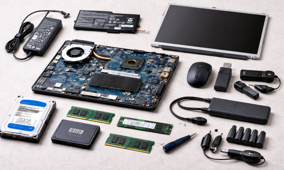 Kami menyediakan berbagai aksesoris dan sparepart laptop original maupun kompatibel berkualitas, seperti charger, baterai, keyboard, layar, dan lainnya.